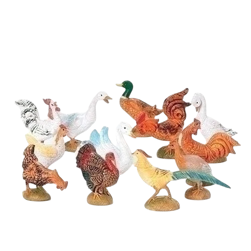 Enhance your nativity scene with the delightful Fontanini Bird Figurines Set, featuring a charming assortment of 12 beautifully crafted pieces! Made in Italy and designed in a 5-inch scale, this exquisite set includes a variety of colorful birds, including roosters, ducks, and hens, each meticulously detailed to bring life and vibrancy to your holiday display.