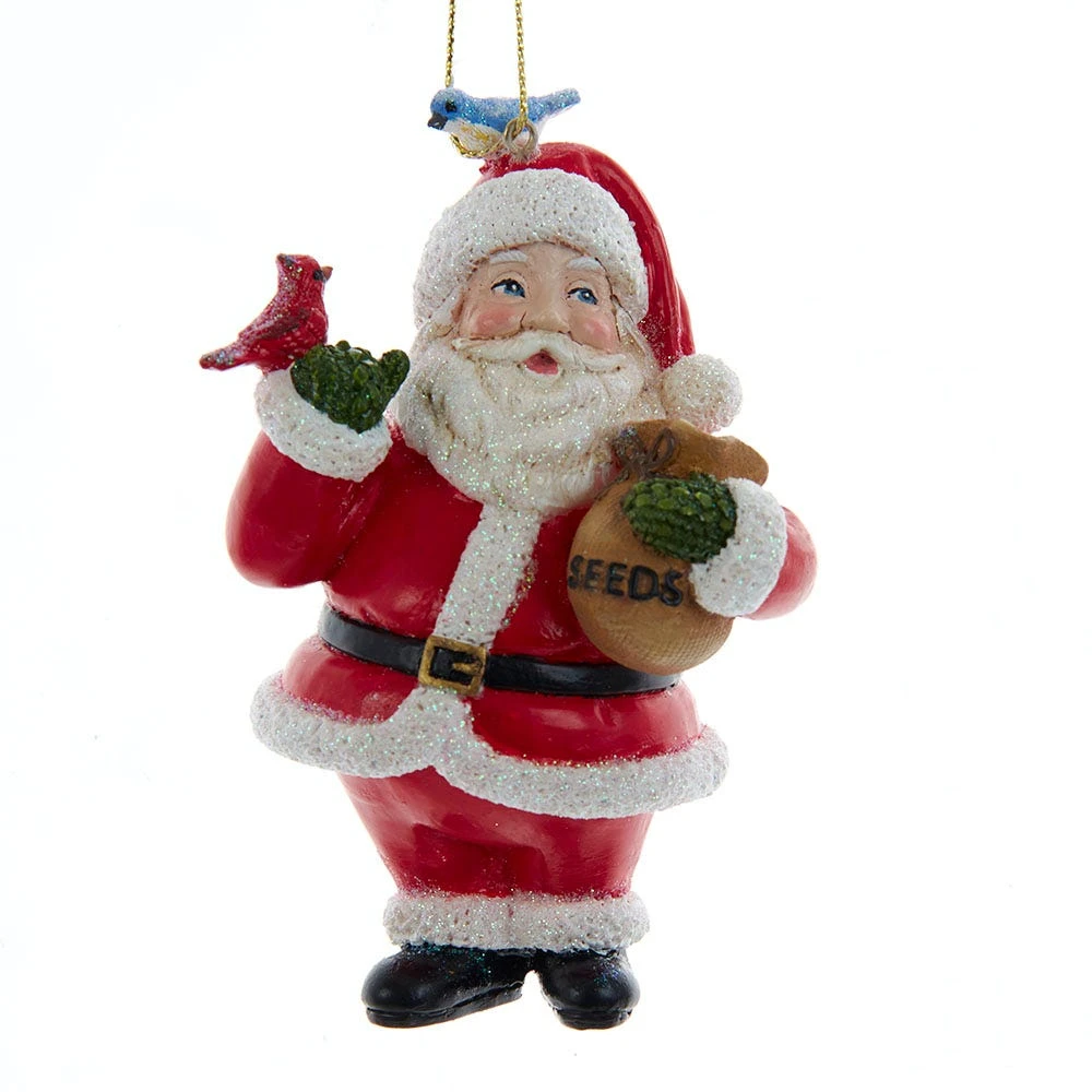This Santa with birds ornament from Kurt Adler is a festive addition to any holiday décor or Christmas tree. Santa is wearing his traditional red and white Santa suit, in one hand is a glittered red cardinal and in the other he is holding a bag of “Seeds.”