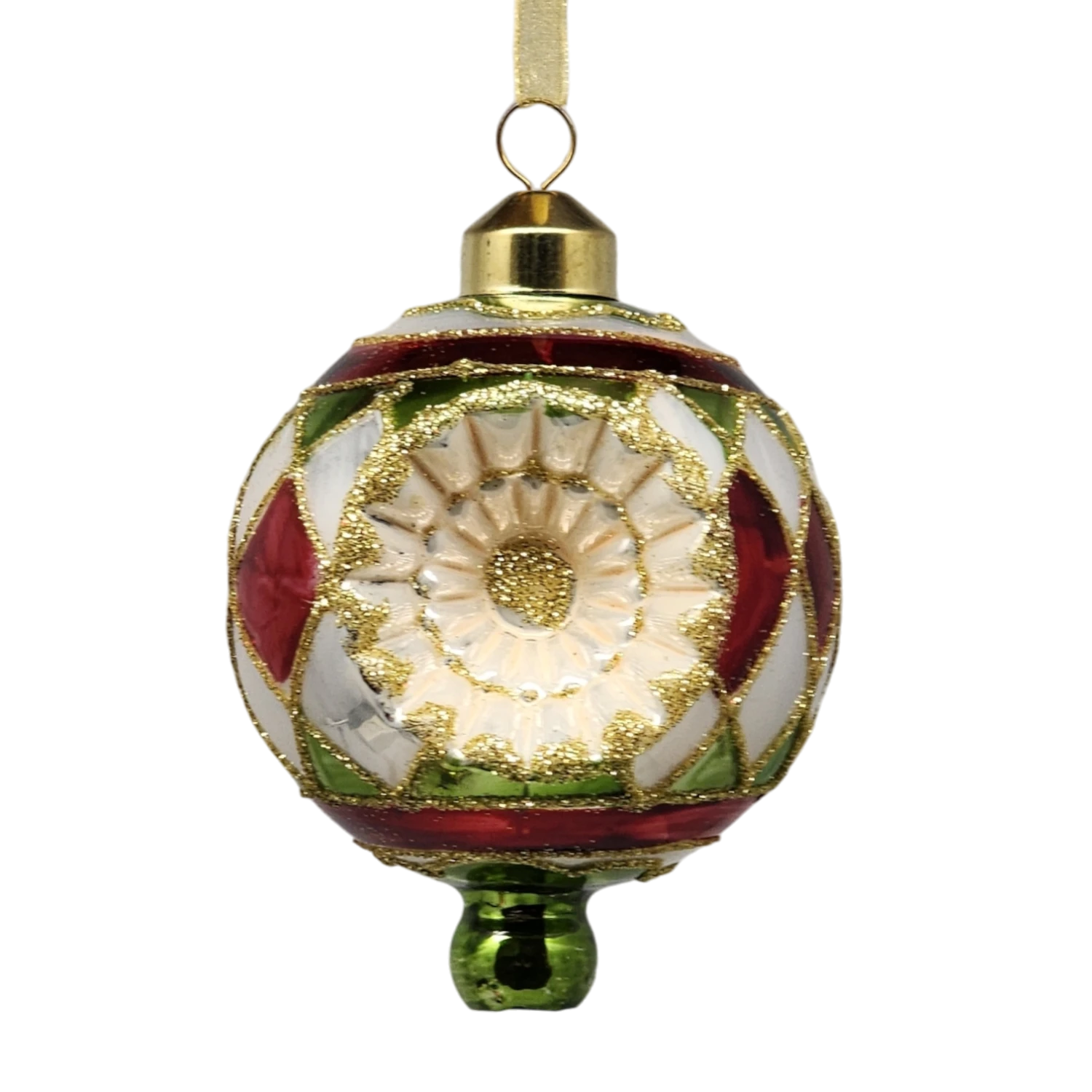 Add a touch of nostalgia to your holiday decor with this classic reflector-style glass bauble ornament. Measuring about 3 inches in diameter, this stunning ornament features a beautifully mirrored surface adorned with vibrant red, green, and gold accents. The intricate diamond pattern captures the light, creating a sparkling display that will enhance your Christmas tree.