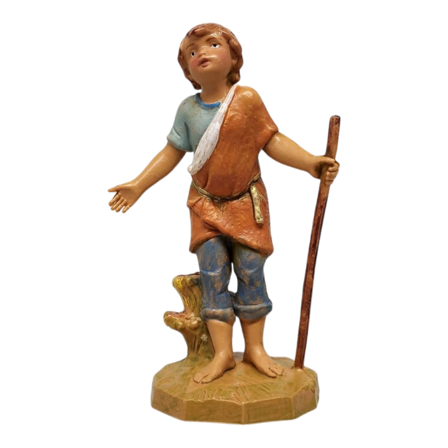 Savio holds a slender staff in his right hand, a classic symbol of shepherds, while his extended arm suggests a welcoming gesture, inviting viewers into the serene world of the Nativity scene. The figure stands on a small, rounded base that mimics the appearance of natural ground, enhancing the rustic charm of the piece. The black background of the image emphasizes the figure’s details, allowing the viewer to appreciate the craftsmanship without distraction. This figurine not only adds a touch of elegance to your holiday decor but also serves as a reminder of the humble beginnings of the Nativity story, making it a meaningful addition to any collection.
